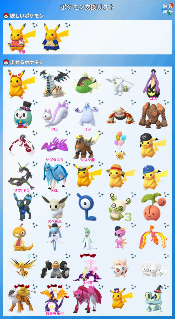 ポケモン(求):イワンコ(非たそがれ)、ニャスパー ⇄ シキジカ(はる、ふゆ)、WCS2025ピカチュウ ⇄ メグロコ