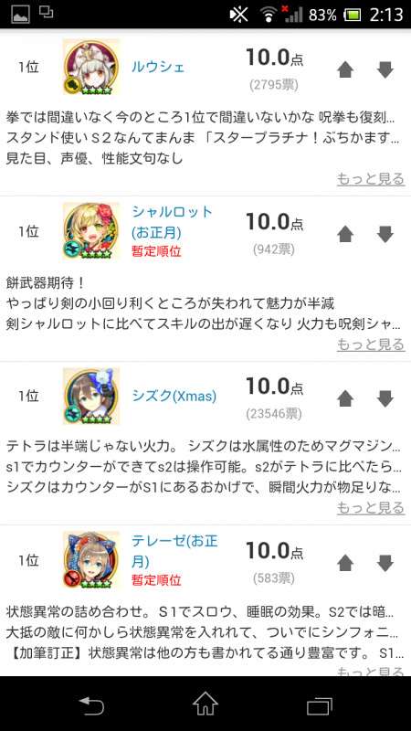 なのでシャナオウよりは貢献度ランキングは上でいいと思いますが、1位のメンツ(テトライダーツキミルウシェ)をみると、流石に10点や9.9点などの評価は流石に高すぎですね・・・シャルもそうですが