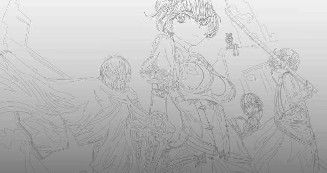 構図、背景はそれらしいイラストを拾って立ち絵や公式の特設トップ絵を元に当てはめてその構図になるように。後ろ姿なんかはフィギュア画像を元にしたり。ニナは茶熊カスミが元だったり、ツァラはネタ元?のファントム絵をツァラ風に手を加えたり(´・ω・`)オリジナルは描けんとです…