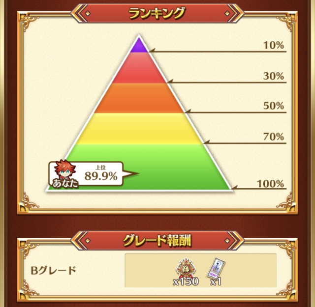 普通?それなりに重い課金を続けるか、運良くキーポイントのキャラ当ててめちゃめちゃやり込まないと、50位以内は無理。