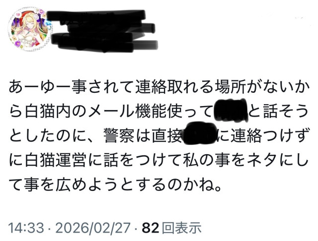 男君にTwitterブロックされたから白猫運営に男君と連絡を取らせろと言ってるのに言う事聞かない。男君との仲を引き裂いてくる浅井P他白猫関係者に暴言リプ送ってた