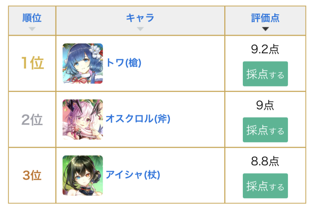 尚、評価点はトワが1位です。もってないので分かりませんが