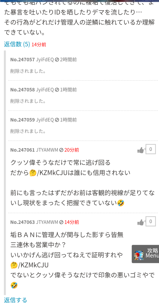 確証はないけどね、でも荒らしの暴言スクショ5枚程貼り付けて運営さんなんとかして下さいと書き込んだら、数分で垢バンされていたよ