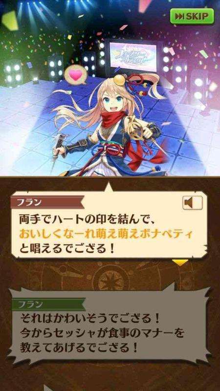 | フランが控えにいる状態で、自動発動する。 洋梨をキャドゥ―して味方のHPとSPを回復する。 <仲間への付与効果> 防御力UP(60秒/100%) スキルダメージUP(60秒/100%/3回) 自動復活(60秒/クエスト中1回) ※再発動時間45秒 |