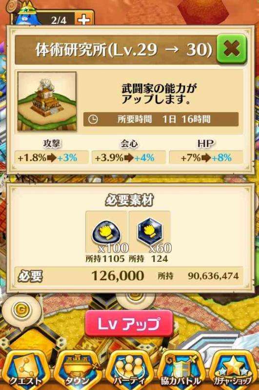 剣士研究所のレベルアップ画面でのステータスアップは攻撃 防御 会心のみ表示で、HP SPの表示はありません。